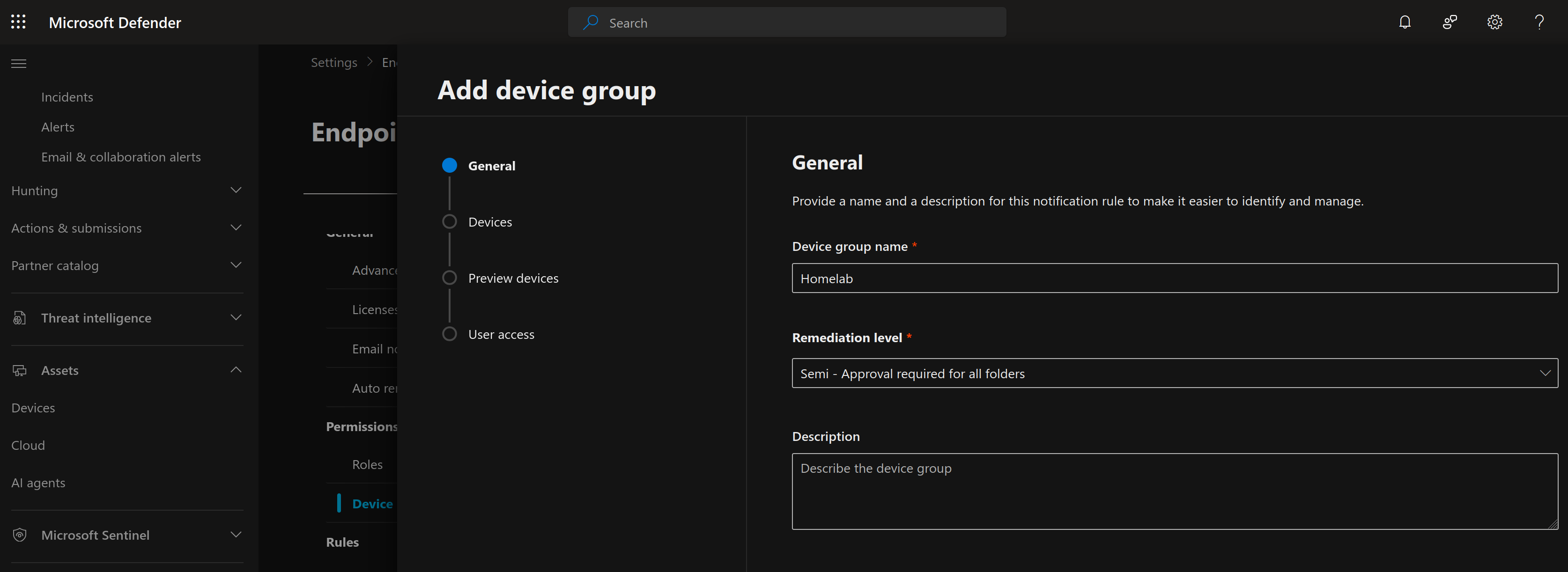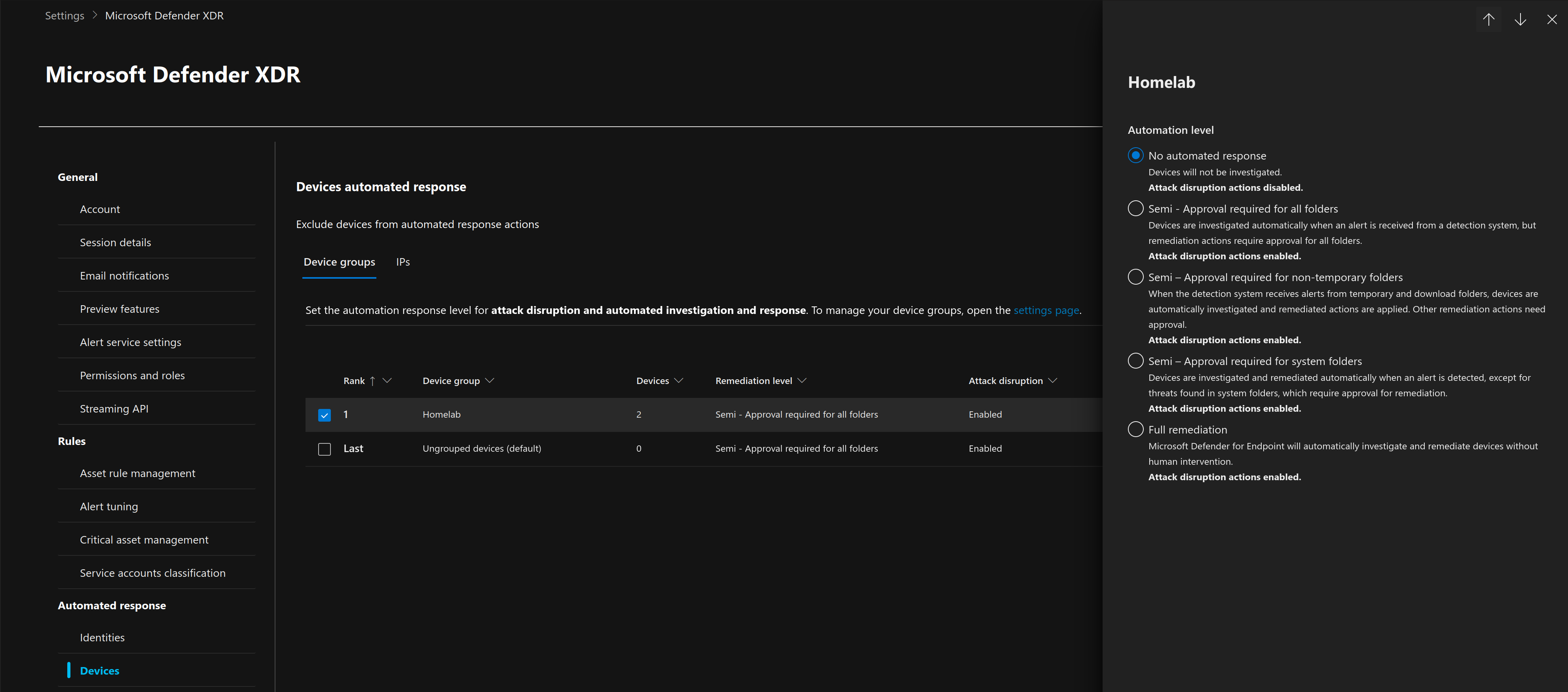 Before we continue and try to execute any attacks, lets first make a new device group for our lab so that we can configure how we want automated investigation and remediation to proceed. Since we are testing the automated response capabilities, I want to always require approval before remediation. On the Settings page, under Permissions, select Device groups and add a new device group.
