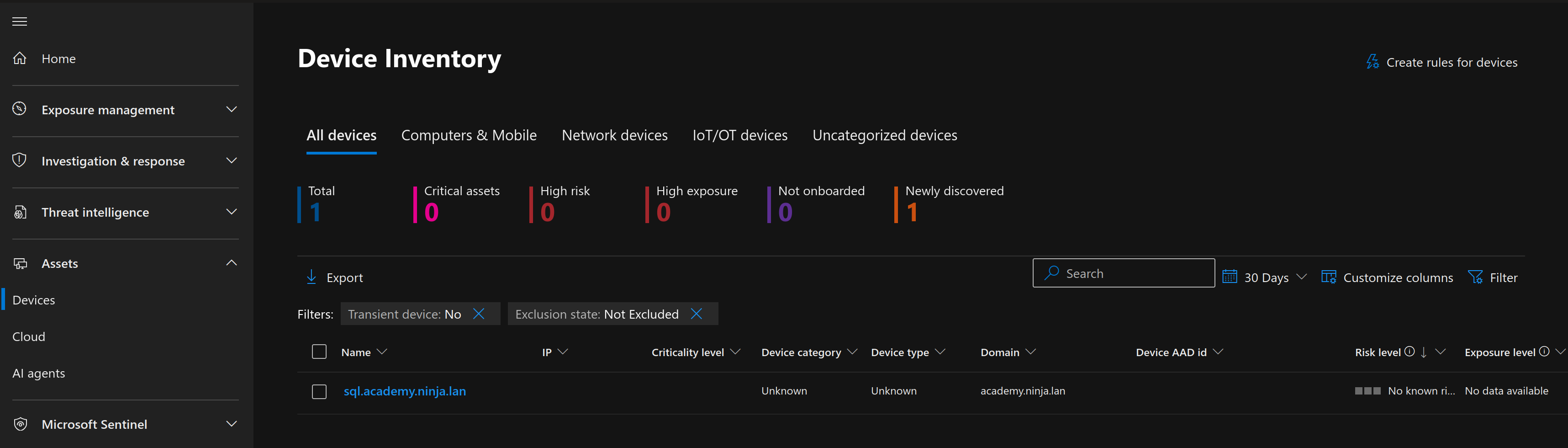 Then under the Devices section, I made a rule to match all endpoints that end with the domain "ninja.lan", which is one of the Ludus ranges we build in a previous blog post. Since we are testing the detection capabilities of our future attacks, I set the automation level to "No automated response".