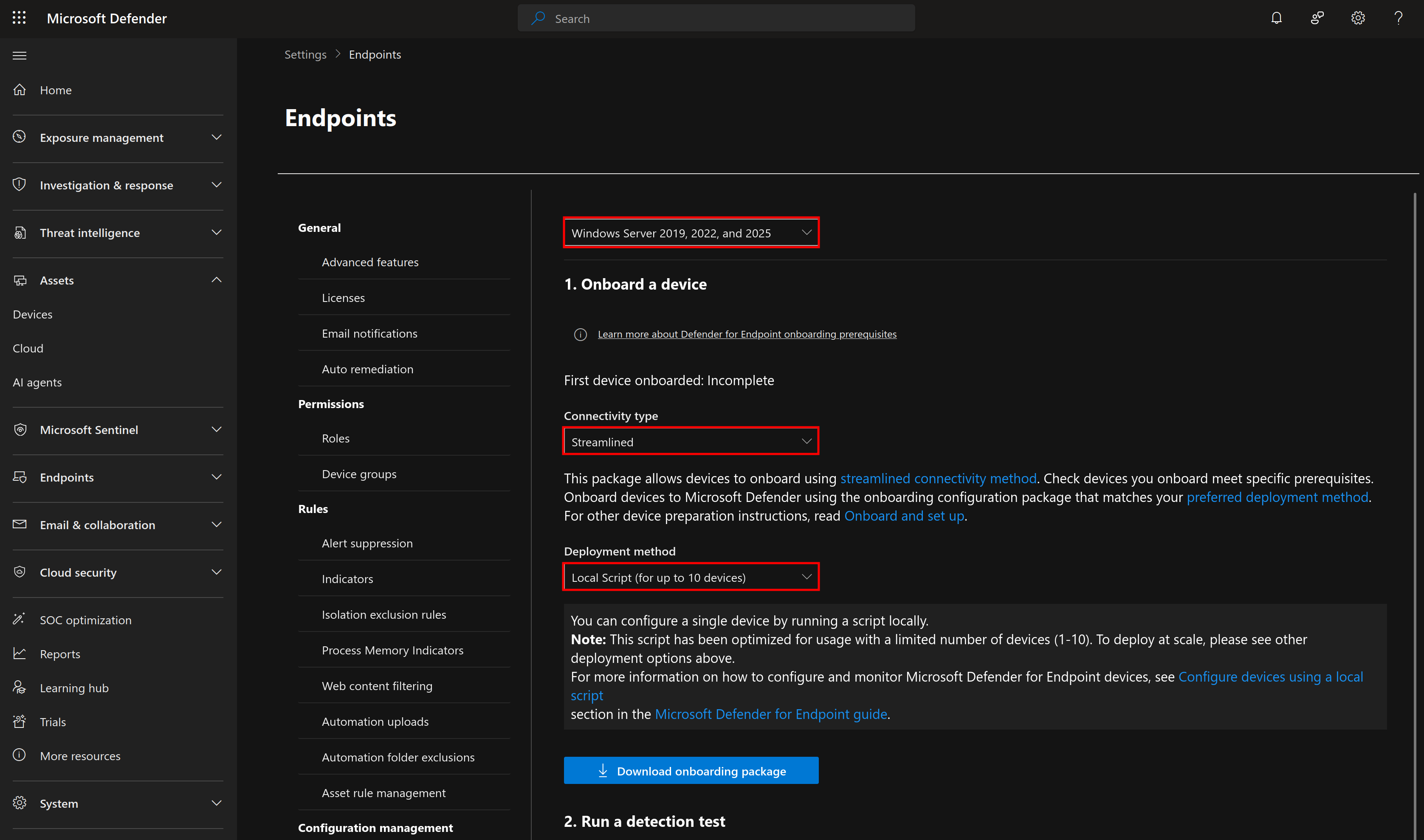 Go ahead and click on Onboard devices, which should bring you to a page to download onboarding packages for each device type. For my first device, I will select the Windows Server 2019, 2022, and 2025 package, and choose the streamlined local script deployment.