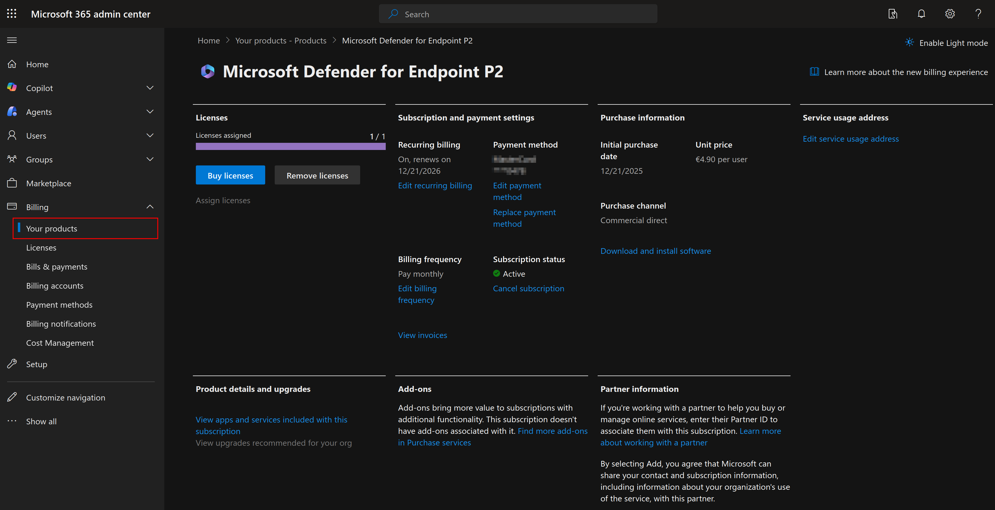 In order to onboard devices with MDE, you need to have a tenant in Microsoft Entra. In case you already have an active tenant (e.g. <tenant-name>.onmicrosoft.com), we can activate a MDE license in the Microsoft 365 admin center. In the navigation pane, expand Billing, and select Your products. I chose for the Defender for Endpoint Plan 2 as it includes full EDR features, advanced hunting, automatic investigations and remediations, automatic attack disruption and live response.