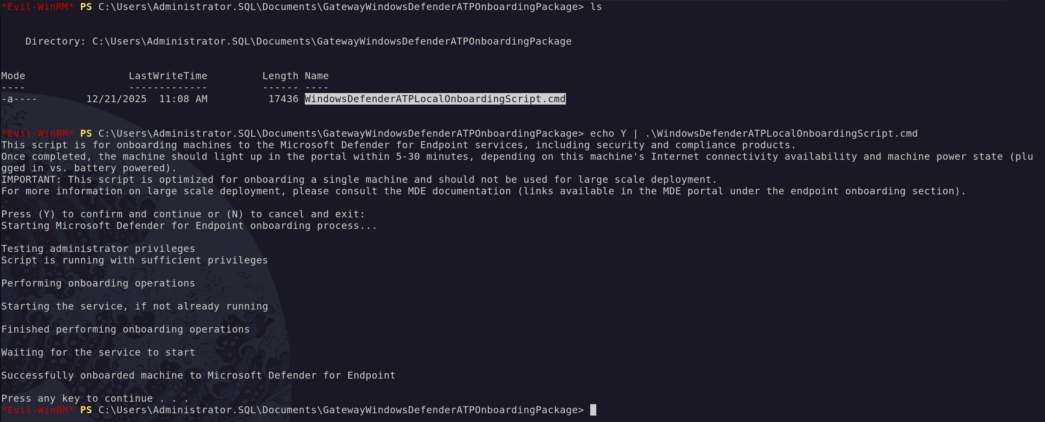 We can then run the onboarding script on one of our servers. And yes I know it is quite ironic, but I used Evil-WinRM to onboard my device. A subtle reminder that even “evil” tools can have a redemption arc.