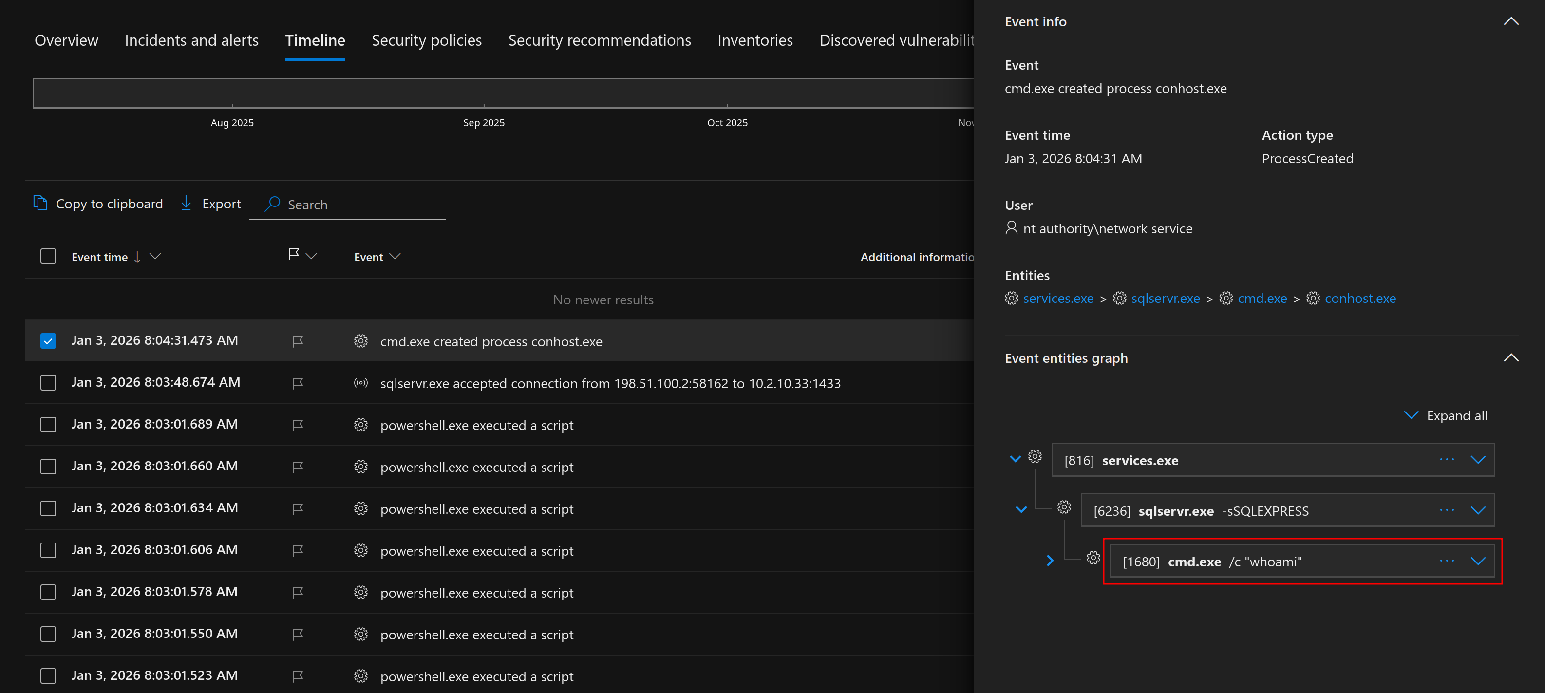 In this case, the database is running as NT AUTHORITY\Network Service. Over in Microsoft Defender for Endpoint, we can see the corresponding process creation event: